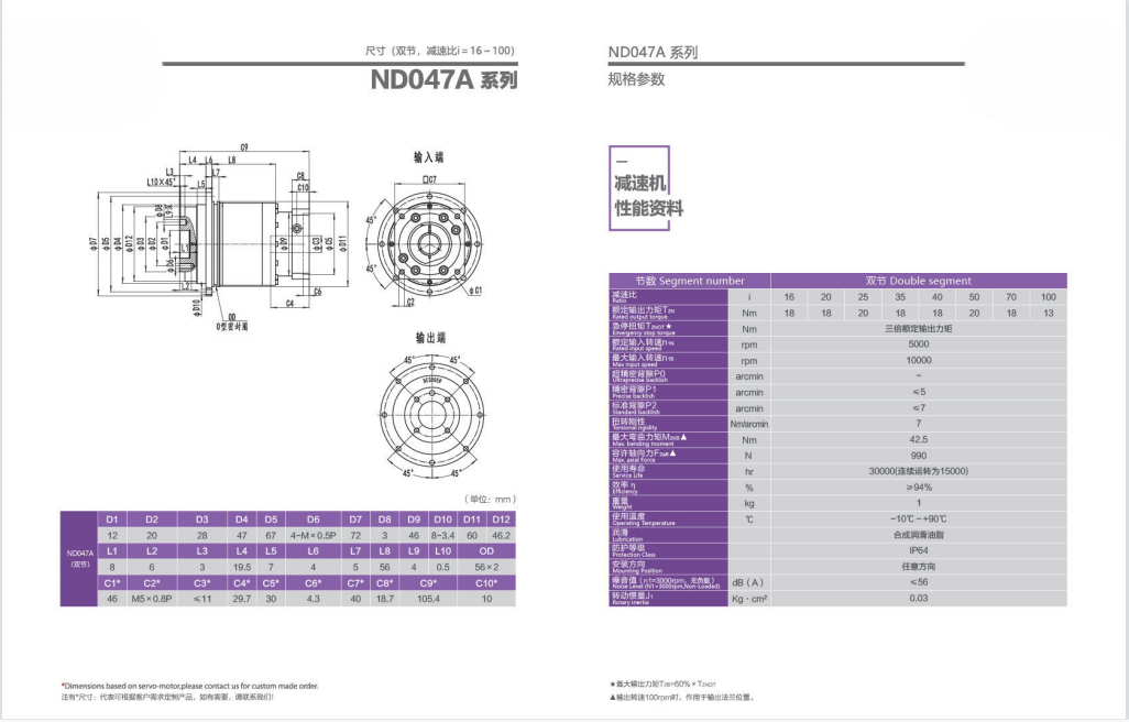 ND047A系列超精密背隙行星減速機系列(P0): ND047A系列精密背隙行星減速器系列(P1): ND047A系列標準背隙行星減速機系列(P2):