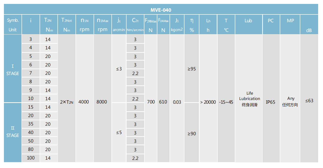 MVE-040-L2系列超精密背隙行星減速機系列(P0): MVE-040-L2系列精密背隙行星減速器系列(P1): MVE-040-L2系列標準背隙行星減速機系列(P2):