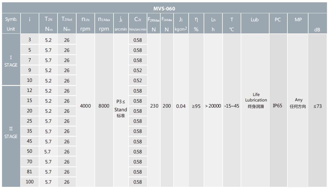 MVS-060-L2系列超精密背隙行星減速機(jī)系列(P0): MVS-060-L2系列精密背隙行星減速器系列(P1): MVS-060-L2系列標(biāo)準(zhǔn)背隙行星減速機(jī)系列(P2):